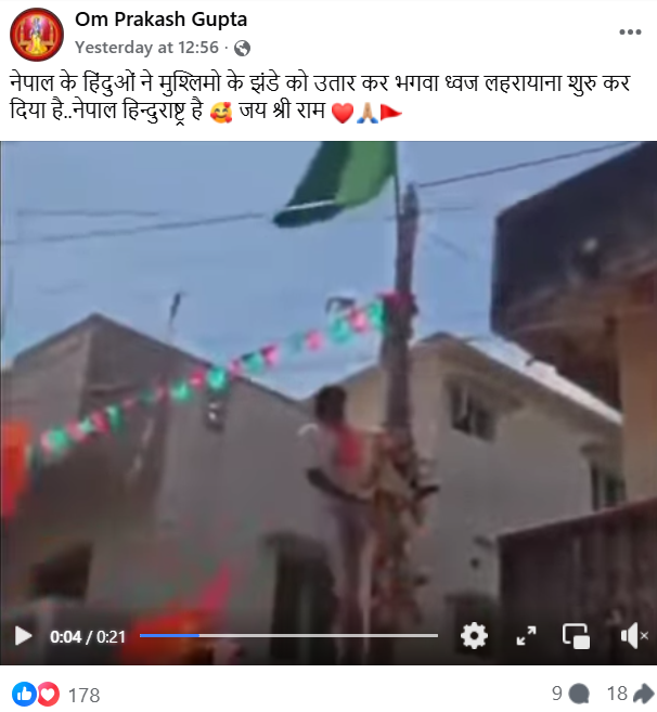 सोशल मीडिया पर एक वीडियो नेपाल का बताकर शेयर किया जा रहा है। इस वीडियो में देखा जा सकता है कि एक युवक हरा झंडा उतारकर भगवा झंडा लगा देता है। इस वीडियो के साथ किया जा रहा है कि नेपाल में हिन्दुओं द्वारा मुस्लिमों का झंडा उतारकर भगवा लहराया जा रहा है।