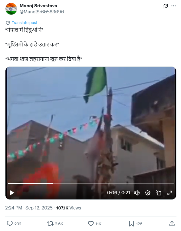 मनोज श्रीवास्तव नामक यूजर ने वीडियो शेयर करते हुए लिखा, ‘*नेपाल में हिंदुओं ने* *मुश्लिमो के झंडे उतार कर* *भगवा ध्वज लहरायाना शुरु कर दिया है*’