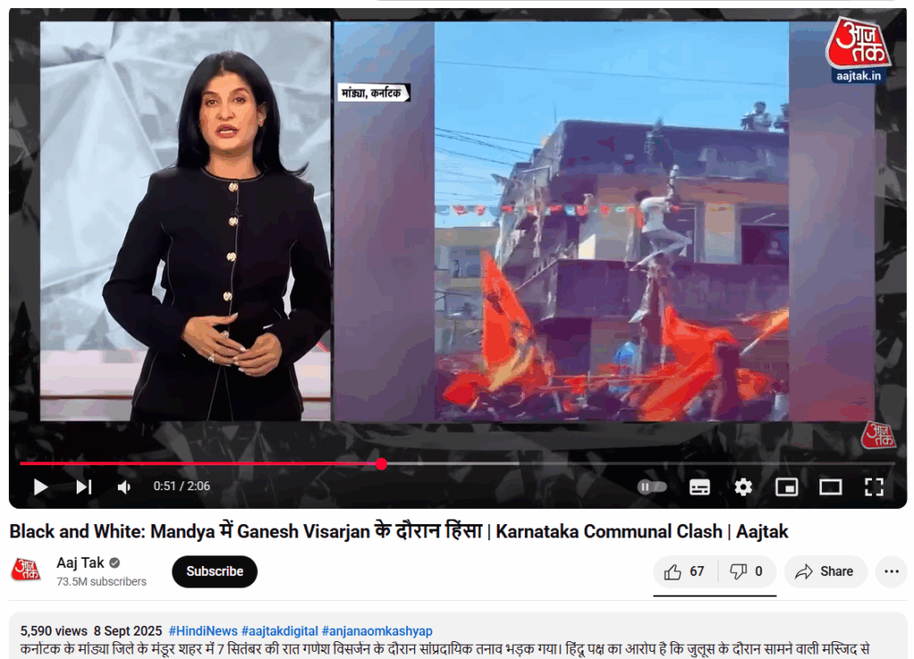 वहीं आज तक की एक रिपोर्ट में इस घटना का स्क्रीनग्रैब देखा जा सकता है। इस रिपोर्ट में बताया गया है, ‘कर्नाटक के मांड्या जिले के मंडूर शहर में 7 सितंबर की रात गणेश विसर्जन के दौरान सांप्रदायिक तनाव भड़क गया। हिंदू पक्ष का आरोप है कि जुलूस के दौरान सामने वाली मस्जिद से पथराव किया गया, जिससे दोनों पक्षों में हिंसा फैल गई। इस घटना के विरोध में हिंदू संगठनों ने प्रदर्शन किया, जिसमें एक प्रदर्शनकारी ने हरे झंडे को हटाकर भगवा झंडा लगा दिया, जिससे इलाके में तनाव और बढ़ गया। स्थिति को नियंत्रित करने के लिए पुलिस को लाठीचार्ज करना पड़ा।’