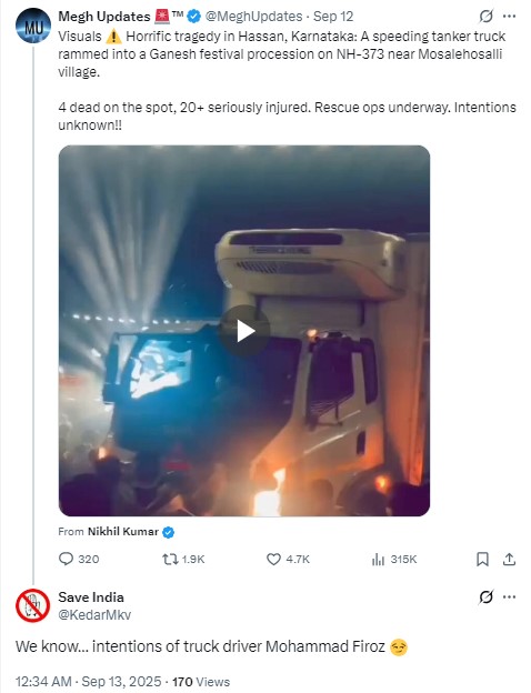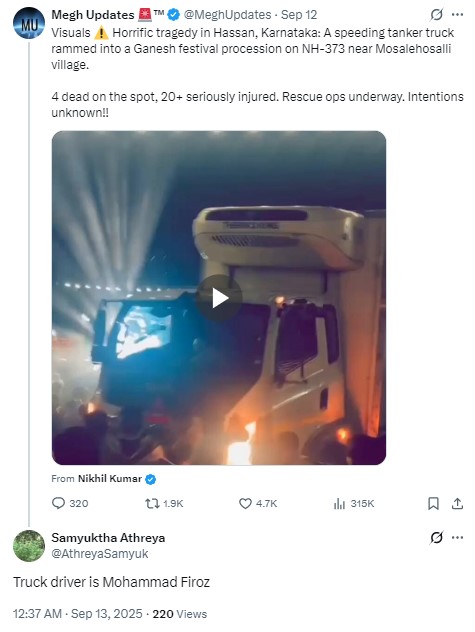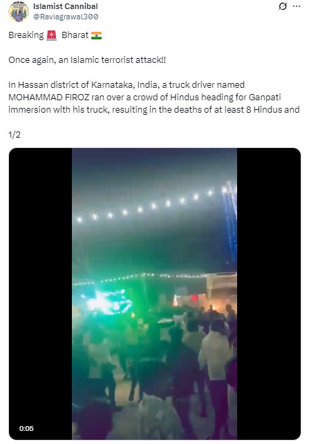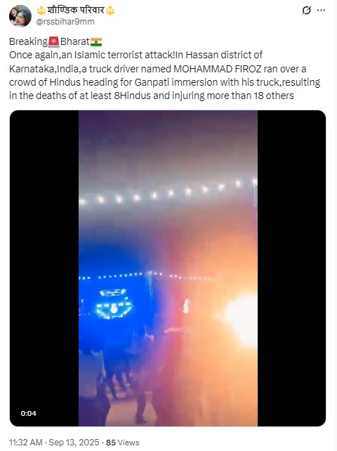 वहीं एक अन्य यूजर 🔱शौण्डिक परिवार🔱 ने वायरल वीडियो को शेयर कर लिखा कि ब्रेकिंग🚨भारत🇮🇳 एक बार फिर, एक इस्लामी आतंकवादी हमला! भारत के कर्नाटक के हसन ज़िले में, मोहम्मद फ़िरोज़ नाम के एक ट्रक ड्राइवर ने गणपति विसर्जन के लिए जा रहे हिंदुओं की भीड़ को अपने ट्रक से कुचल दिया, जिसके परिणामस्वरूप कम से कम 8 हिंदुओं की मौत हो गई और 18 से ज़्यादा घायल हो गए।