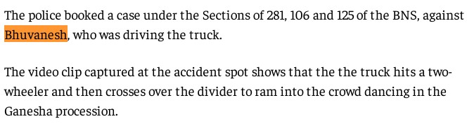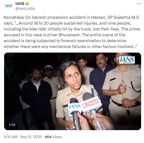 इसके अलावा हमें X पर न्यूज़ एजेंसी IANS का भी एक पोस्ट मिला। जिसमें हासन में गणेश जुलूस दुर्घटना पर एसपी सुजीता एम.एस. के हवाले से बताया गया कि “…लगभग 18 से 20 लोग घायल हुए हैं और ट्रक की चपेट में आए बाइक सवार सहित नौ लोगों की मौत हो गई। इस मामले का मुख्य आरोपी ड्राइवर भुवनेश है। दुर्घटना के पूरे दृश्य की फोरेंसिक जांच की जा रही है ताकि यह पता लगाया जा सके कि क्या कोई यांत्रिक खराबी थी या अन्य कोई कारण था…”
