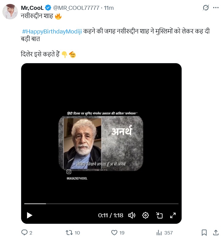 नसीरुद्दीन शाह के इस वीडियो को शेयर करते हुए मिस्टर कूल नामक यूजर ने लिखा, ‘नसीरुद्दीन शाह. #HappyBirthdayModiji कहने की जगह नसीरुद्दीन शाह ने मुस्लिमों को लेकर कह दी बड़ी बात दिलेर इसे कहते हैं’