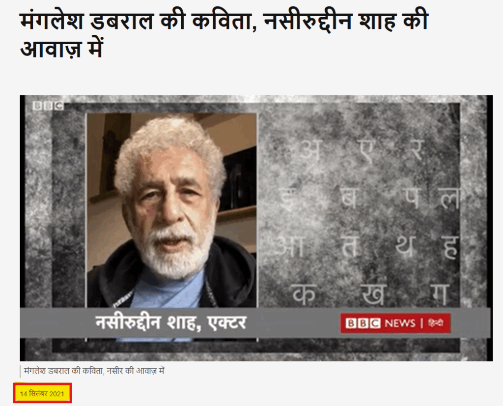 DFRAC की टीम ने वायरल वीडियो की जांच करने पर पाया कि नसीरुद्दीन शाह का यह वीडियो हाल-फिलहाल का नहीं, वर्ष 2021 का है और नसीरुद्दीन शाह ने यह कविता पीएम मोदी के जन्मदिन पर नहीं, बल्कि हिन्दी दिवस के अवसर पर पढ़ी थी। हमें यह वीडियो बीबीसी की 14 सितंबर 2021 की एक रिपोर्ट में मिला, जिसमें बताया गया है, ‘नसीरुद्दीन शाह ने हिंदी दिवस के मौके पर मंगलेश डबराल की लोकप्रिय कविता ‘एक भाषा में अ लिखना चाहता हूं…’ पढ़ी है।’