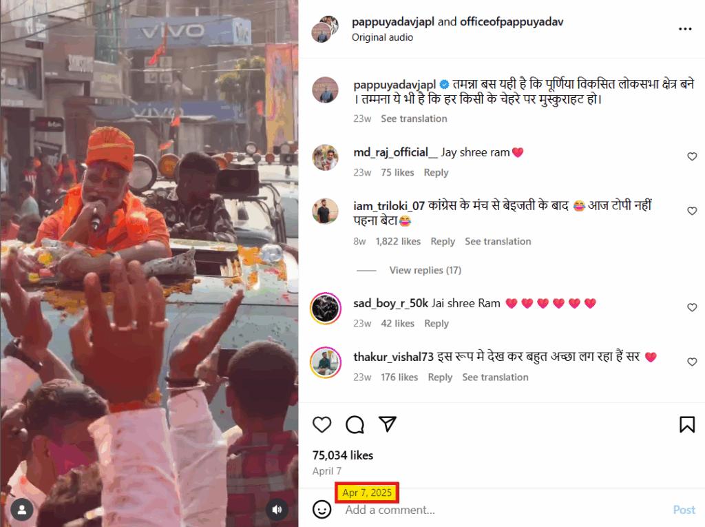DFRAC की टीम ने वायरल वीडियो की जांच करने पाया कि पप्पू यादव का श्रीराम भजन गाने का वीडियो हाल-फिलहाल का नहीं है। यह वीडियो अप्रैल में रामनवमी के अवसर का है, जब पप्पू यादव ने रामभजन गाया था। इस वीडियो को पप्पू यादव के आधिकारिय इंस्टाग्राम अकाउंट पर 7 अप्रैल को पोस्ट किया गया है।