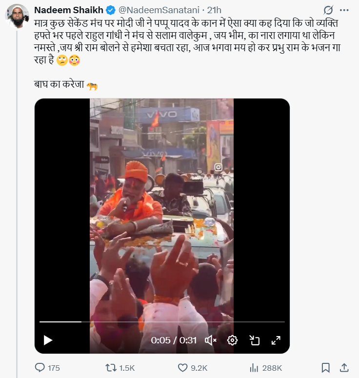 इस वीडियो को शेयर करते हुए Nadeem Shaikh नामक यूजर ने लिखा, ‘मात्र कुछ सेकेंड मंच पर मोदी जी ने पप्पू यादव के कान में ऐसा क्या कह दिया कि जो व्यक्ति हफ्ते भर पहले राहुल गांधी ने मंच से सलाम वालेकुम , जय भीम, का नारा लगाया था लेकिन नमस्ते ,जय श्री राम बोलने से हमेशा बचता रहा, आज भगवा मय हो कर प्रभु राम के भजन गा रहा है.. बाघ का करेजा’
