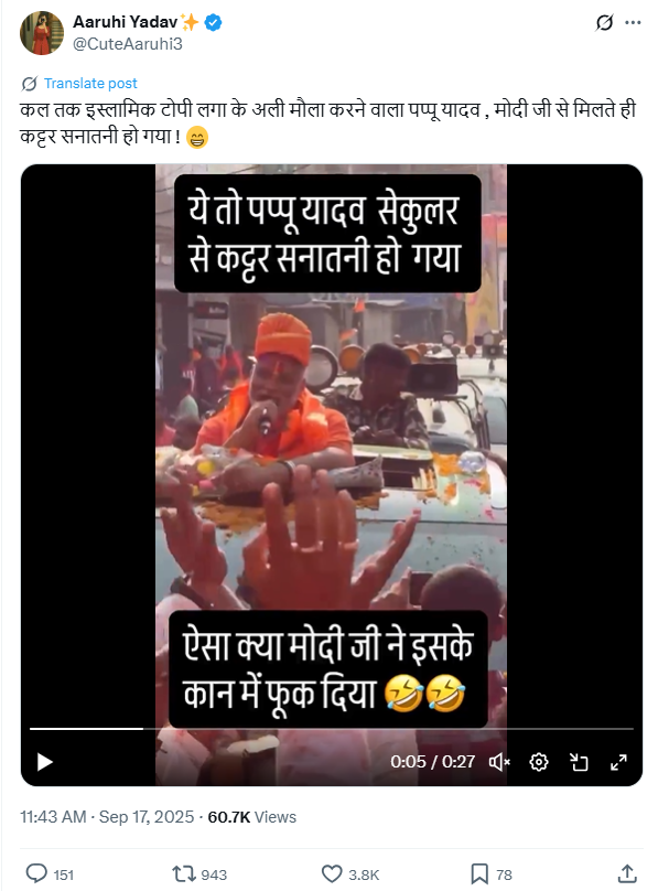 आरूही यादव नामक यूजर ने लिखा, ‘कल तक इस्लामिक टोपी लगा के अली मौला करने वाला पप्पू यादव , मोदी जी से मिलते ही कट्टर सनातनी हो गया !’