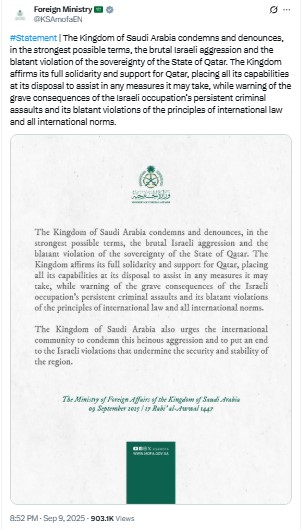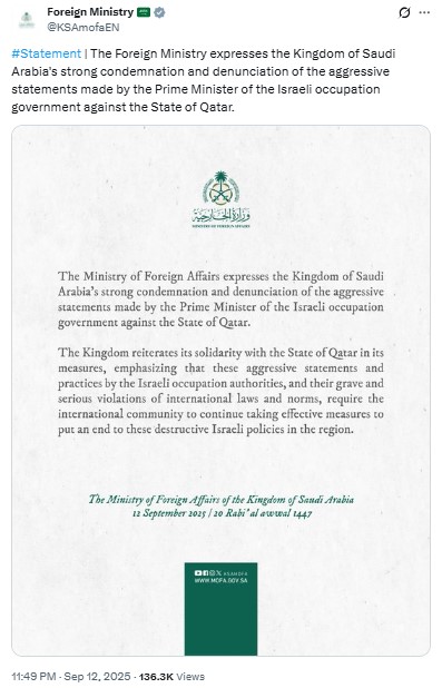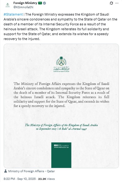 इसके अलावा हमें सऊदी विदेश मंत्रालय के कतर पर इजरायल हमले के खिलाफ बयान मिले। लेकिन उनमें भी कहीं पर इस प्रकार का कोई उल्लेख नहीं है कि सऊदी अरब ने इजरायल से कतर पर हमले का बदला लेने की कोई घोषणा की हो।