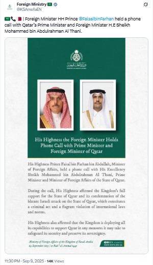 इसके साथ ही हमने X पर सऊदी विदेश मंत्रालय के हैंडल को भी देखा। इस दौरान हमें सऊदी क्राउन प्रिंस मुहम्मद बिन सलमान का जीसीसी सुप्रीम काउंसिल सत्र और अरब-इस्लामी शिखर सम्मेलन के बाद कतर के अमीर को आभार संदेश भी मिला। लेकिन उसमे भी इस प्रकार का कोई उल्लेख नहीं मिला।