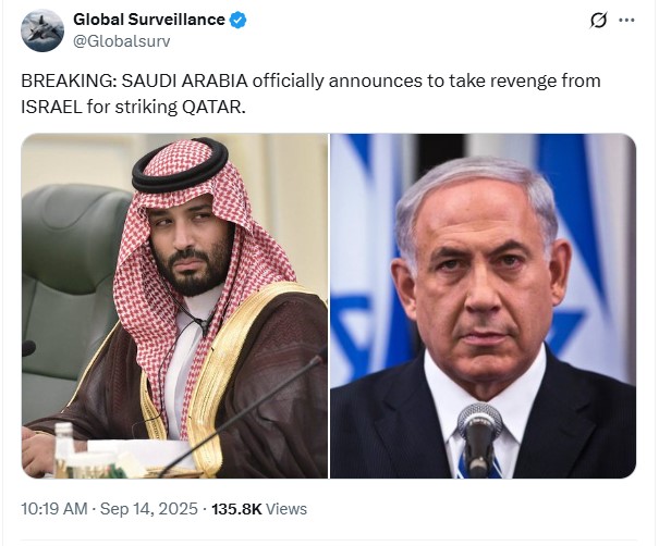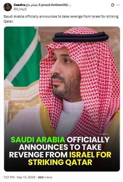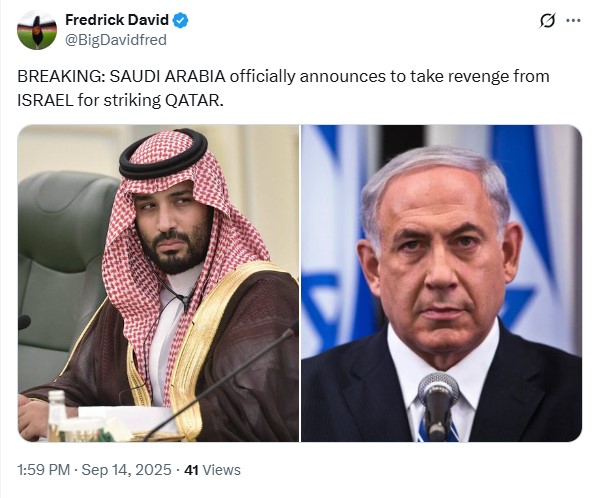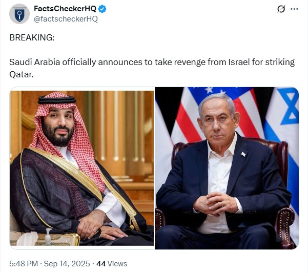 सोशल साईट X पर वेरिफाइड यूजर फ्रेडरिक डेविड ने सऊदी अरब के क्राउन प्रिंस मुहम्मद बिन सलमान और इजरायल के बेंजामिन नेतन्याहू की तस्वीरों को शेयर करते हुए लिखा कि “ब्रेकिंग: सऊदी अरब ने कतर पर हमले के लिए इजरायल से बदला लेने की आधिकारिक घोषणा की है।“