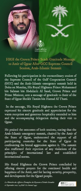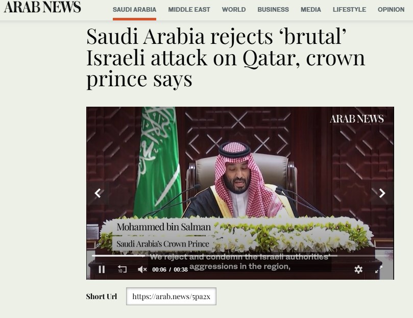 हालांकि हमें कतर पर इजरायल हमले के बाद क्राउन प्रिंस मुहम्मद बिन सलमान से जुड़ी अरब न्यूज़ एक रिपोर्ट मिली। 10 सितंबर 2025 को पब्लिश इस रिपोर्ट में उन्होंने कहा कि सऊदी अरब क्षेत्र में इज़राइली हमलों को खारिज करता है और उनकी निंदा करता है। क्राउन प्रिंस ने कहा कि इस तरह के आक्रमण का मुकाबला करने के लिए अरब, इस्लामी और अंतर्राष्ट्रीय कार्रवाई आवश्यक है। उन्होंने आगे कहा कि इज़राइली सेना को उसके आपराधिक कृत्यों से रोकने के लिए भी अंतर्राष्ट्रीय उपायों की आवश्यकता है जो क्षेत्र की सुरक्षा और स्थिरता के लिए खतरा हैं। उन्होने ये भी कहा कि “हम कतर के सभी कार्यों में बिना किसी सीमा के उसके साथ खड़े रहेंगे और इसे हासिल करने के लिए अपनी पूरी क्षमता का उपयोग करेंगे।”