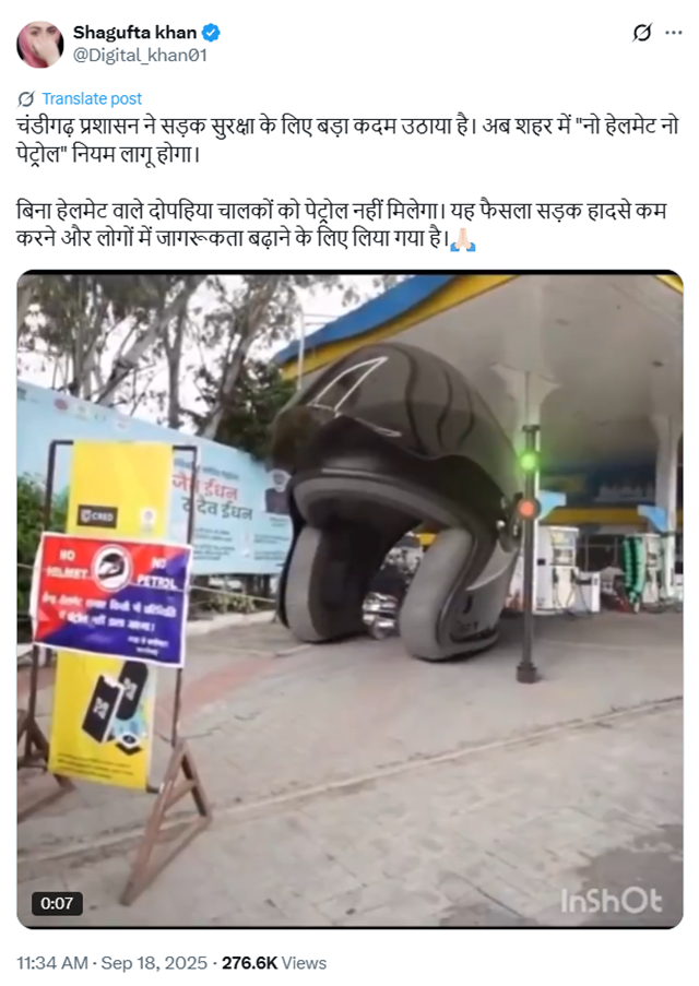 एक्स यूज़र @Digital_khan01 ने एक वीडियो शेयर कर दावा किया है कि “चंडीगढ़ प्रशासन ने सड़क सुरक्षा के लिए बड़ा कदम उठाया है। अब शहर में “नो हेलमेट नो पेट्रोल” नियम लागू होगा। बिना हेलमेट वाले दोपहिया चालकों को पेट्रोल नहीं मिलेगा। यह फैसला सड़क हादसे कम करने और लोगों में जागरूकता बढ़ाने के लिए लिया गया है।”