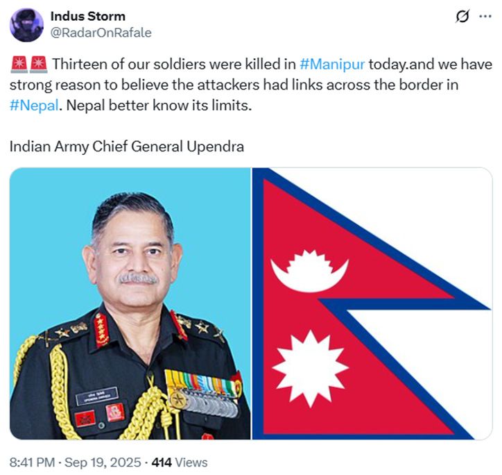 एक एक्स यूजर @RadarOnRafale ने दावा करते हुए लिखा “आज मणिपुर में हमारे तेरह सैनिक शहीद हो गए, और हमारे पास यह मानने के पुख्ता कारण हैं कि हमलावरों के तार सीमा पार #नेपाल से जुड़े थे। नेपाल को अपनी सीमाएँ समझनी चाहिए। भारतीय सेनाध्यक्ष जनरल उपेंद्र।” (हिन्दी अनुवाद)