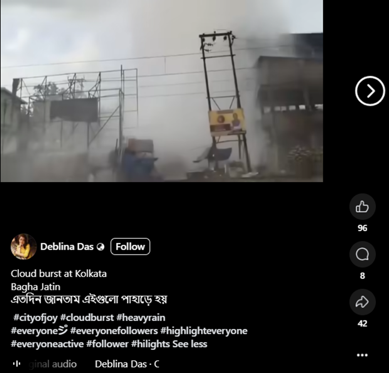 एक फेसबुक यूज़र Deblina Das ने वीडियो शेयर करते हुए कैप्शन में लिखा “कोलकाता में बादल फटा बाघा जतिन (हिंदी अनुवाद)”
