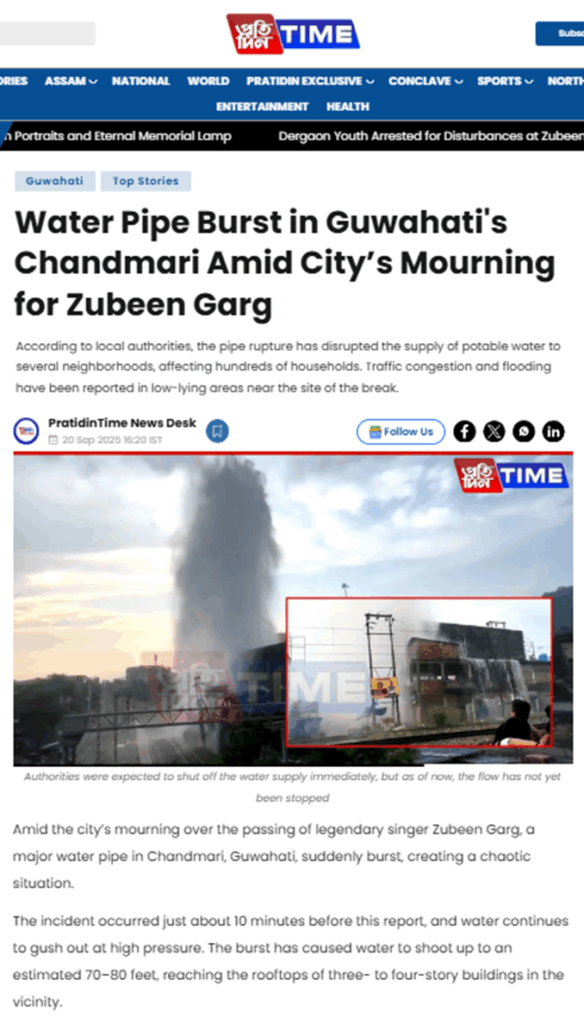 DFRAC ने इस वीडियो के जाँच के लिए वीडियो के की-फ्रेम्स को रिवर्स इमेज सर्च किया। इस दौरान हमें असम की मीडिया आउटलेट Pratidin Times की रिपोर्ट मिली। रिपोर्ट में बताया गया है कि गुवाहाटी के चांदमारी इलाके में 20 सितंबर 2025 को एक बड़ी पानी की पाइपलाइन फट गई थी। पाइप के फटने के बाद पानी तेज रफ्तार से 70-80 फीट की ऊंचाई तक बहने लगा।