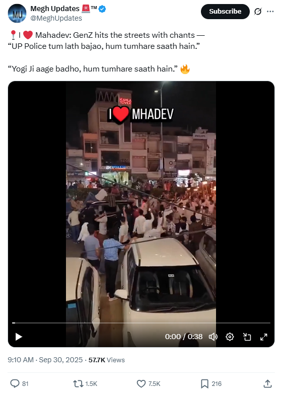वीडियो को शेयर करते हुए मेघ अपडेट्स नामक यूजर ने अंग्रेजी भाषा में कैप्शन लिखा, जिसका हिन्दी अनुवाद है, ‘आई लव महादेव, GenZ नारे के साथ सड़कों पर उतरता है – “यूपी पुलिस तुम लठ बजाओ, हम तुम्हारे साथ हैं।” “योगी जी आगे बढ़ो, हम तुम्हारे साथ हैं।”