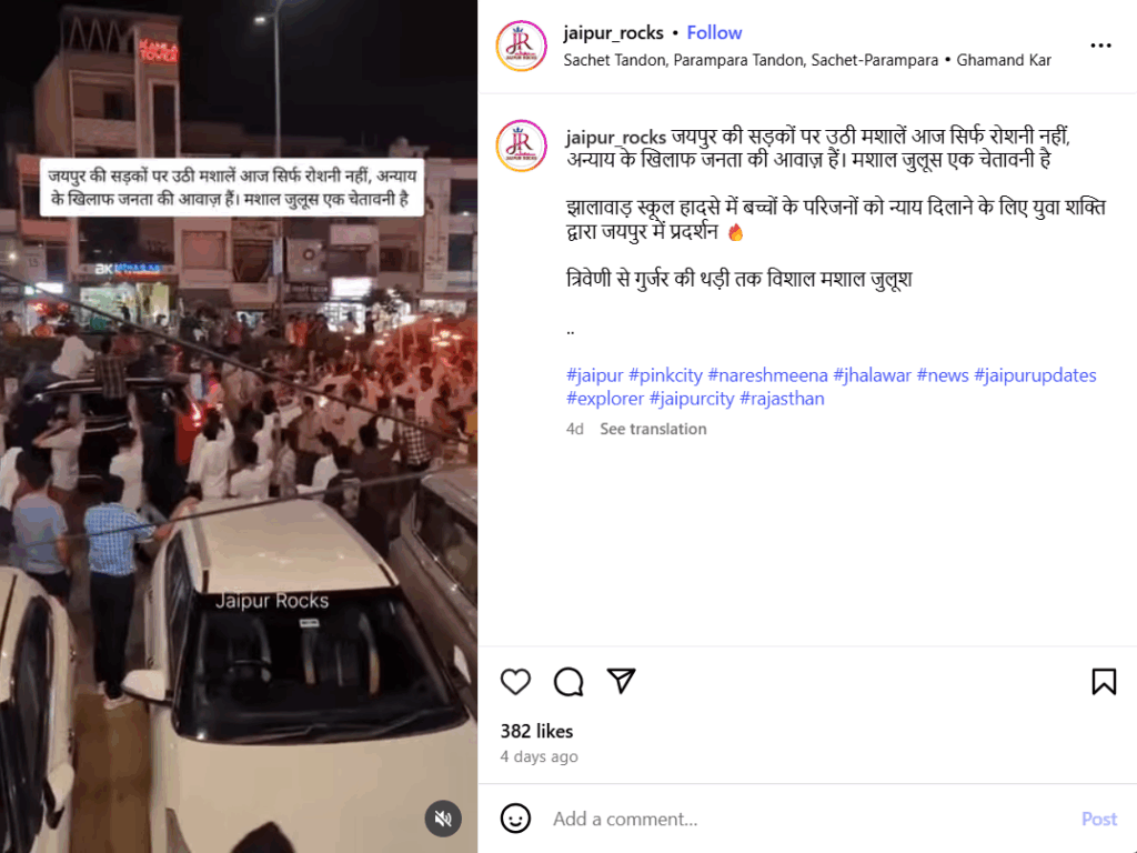 DFRAC की टीम ने वायरल वीडियो की जांच में पाया कि यह वीडियो उत्तर प्रदेश का नहीं है। यह वीडियो राजस्थान की राजधानी जयपुर में निकाले गए मशाल जुलूस का है। वीडियो के कीफ्रेम्स को रिवर्स सर्च करने पर हमने पाया कि इस वीडियो को कई अन्य सोशल मीडिया यूजर्स द्वारा जयपुर में नरेश मीणा द्वारा झालावाड़ के पीपलोदी स्कूल हादसे में मृत बच्चों के पीड़ित परिवारों के साथ इंसाफ के लिए मशाल जुलूस निकालने का बताकर शेयर किया गया है। इन यूजर्स ने बताया कि यह मशाल जुलूस त्रिवेणी नगर से गुर्जर की थड़ी तक निकाला गया था।
