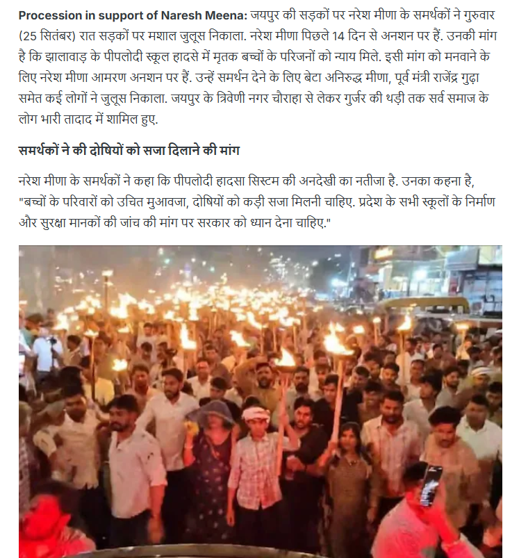 वहीं आगे की जांच में हमने मशाल जुलूस के संदर्भ में गूगल पर कुछ कीवर्ड्स सर्च किया। हमें एनडीटीवी राजस्थान की एक रिपोर्ट मिली, जिसमें बताया गया है, ‘जयपुर की सड़कों पर नरेश मीणा के समर्थकों ने गुरुवार (25 सितंबर) रात सड़कों पर मशाल जुलूस निकाला. नरेश मीणा पिछले 14 दिन से अनशन पर हैं. उनकी मांग है कि झालावाड़ के पीपलोदी स्कूल हादसे में मृतक बच्चों के परिजनों को न्याय मिले. इसी मांग को मनवाने के लिए नरेश मीणा आमरण अनशन पर हैं. उन्हें समर्थन देने के लिए बेटा अनिरुद्ध मीणा, पूर्व मंत्री राजेंद्र गुढ़ा समेत कई लोगों ने जुलूस निकाला. जयपुर के त्रिवेणी नगर चौराहा से लेकर गुर्जर की थड़ी तक सर्व समाज के लोग भारी तादाद में शामिल हुए.’
