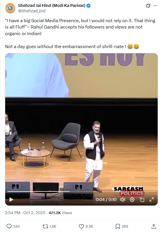 इस वीडियो को शेयर करते हुए बीजेपी नेता शहजाद पूनावाला ने अंग्रेजी भाषा में कैप्शन लिखा, जिसका हिन्दी अनुवाद है, ‘”मेरी सोशल मीडिया पर अच्छी-खासी मौजूदगी है, लेकिन मैं उस पर भरोसा नहीं करूँगा। यह सब बेकार है”~ राहुल गांधी मानते हैं कि उनके फॉलोवर्स और व्यूज ऑर्गेनिक या भारतीय नहीं हैं! कोई भी दिन ऐसा नहीं जाता जब उन्हें शर्मिंदगी का सामना न करना पड़े!’