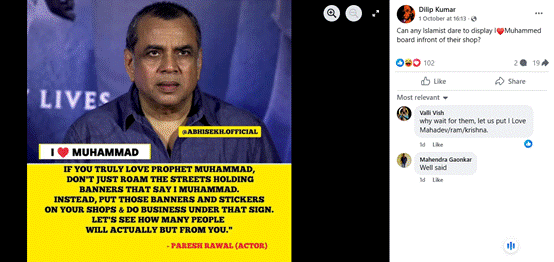 वहीं फेसबुक पर वायरल पोस्टर को शेयर करते हुए एक अन्य यूजर दिलीप कुमार ने लिखा कि क्या कोई इस्लामवादी अपनी दुकान के सामने I Love Muhammed बोर्ड लगाने की हिम्मत कर सकता है?