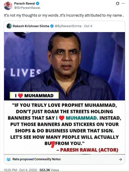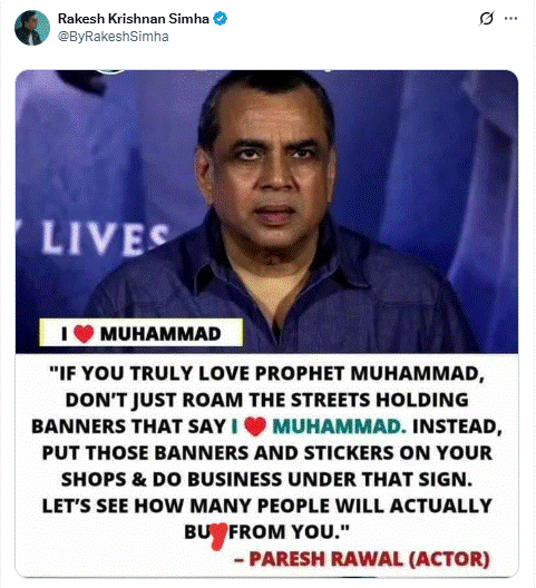 उत्तरप्रदेश के कानपुर में ईद मिलादुन्नबी के अवसर पर आई लव मुहम्मद के पोस्टर लगाने के बाद पुलिस कार्रवाई से उपजा विवाद देश भर में फैल चुका है। इस बीच सोशल मीडिया पर एक पोस्टर वायरल हो रहा है। जिसमे बॉलीवुड अभिनेता परेश रावल के हवाले से लिखा गया है कि “अगर आप सच में पैग़म्बर मुहम्मद से मोहब्बत करते हैं, तो सिर्फ़ सड़कों पर ‘आई लव मुहम्मद’ वाले बैनर लेकर मत घूमिए। बल्कि वे बैनर और स्टिकर अपनी दुकानों पर लगाइए और उसी नाम के तले कारोबार कीजिए। देखते हैं फिर कितने लोग आपसे सच में ख़रीदारी करते हैं।”