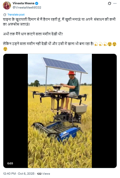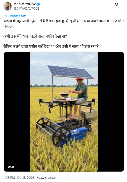 सोशल साईट X पर वेरिफाइड यूजर मिस्टर बीएम यादव ने वायरल वीडियो को शेयर करते हुए लिखा कि चाइना के खुरापाती दिमाग से मैं हैरान रहता हूं, मैं खुशी मनाऊं या अपने कमी का अफसोस जताऊं! अभी तक मैंने धान काटने वाला मशीन देखा था? लेकिन उड़ने वाला मशीन नहीं देखा था और उसी में खाना भी बना रहा है!