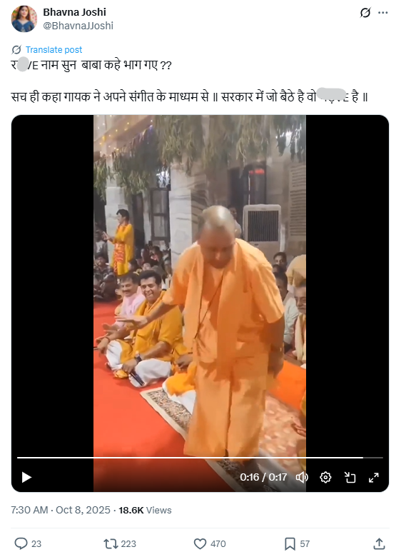 सोशल मीडिया पर उत्तर प्रदेश के सीएम योगी आदित्यनाथ का धार्मिक कार्यक्रम में शिरकत करने एक वीडियो शेयर किया गया है। इस वीडियो को शेयर करने वाले यूजर का दावा है कि गायक द्वारा आपत्तिजनक गीत गाए जाने के बाद सीएम योगी उठकर चले गए। वायरल वीडियो में गोरखपुर के सांसद रवि किशन को गाने पर झूमते हुए भी देखा जा सकता है।