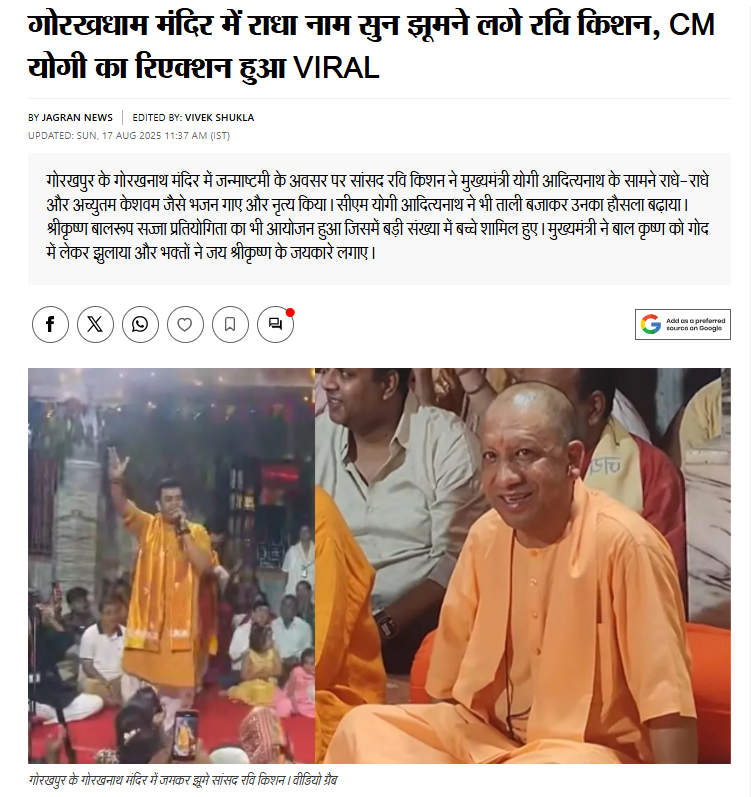वहीं हमें इस संदर्भ में दैनिक जागरण की एक रिपोर्ट मिली, जिसमें बताया गया है, ‘गोरखनाथ मंदिर में जन्माष्टमी पर्व के दौरान एक खास नजारा देखने को मिला। यहां सांसद रवि किशन ने सीएम योगी आदित्यनाथ के सामने जमकर झूमे। रवि किशन ने ‘राधे-राधे’ और ‘अच्युतम केशवम’ जैसे भजन गाए और फिर थिरकने लगे। उनका ये डांस देखकर सीएम योगी आदित्यनाथ भी मुस्कुरा उठे और उन्होंने ताली बजाकर रवि किशन का हौसला बढ़ाया।’