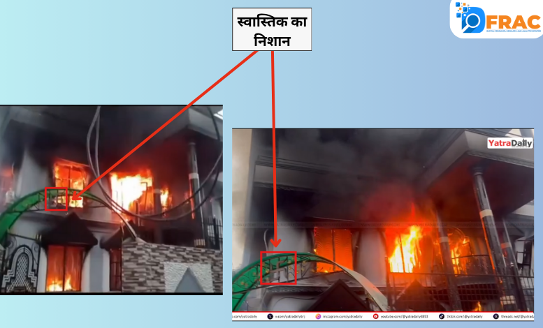 यहां हम एक कोलाज दे रहे हैं, जिसमें देखा जा सकता है कि वायरल वीडियो में दिख रहा जलता हुआ घर एक ही है और घर के दरवाजे पर लगा स्वास्तिक का निशान भी देखा जा सकता है।