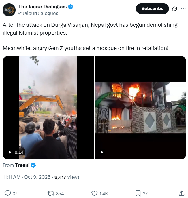 इन दोनों वीडियो को शेयर करते हुए The Jaipur Dialogues नामक यूजर ने अंग्रेजी भाषा में कैप्शन लिखा, जिसका हिन्दी अनुवाद है, ‘दुर्गा विसर्जन पर हुए हमले के बाद, नेपाल सरकार ने अवैध इस्लामी संपत्तियों को ध्वस्त करना शुरू कर दिया है। इस बीच, गुस्साए जेनरेशन ज़ेड के युवाओं ने जवाबी कार्रवाई में एक मस्जिद में आग लगा दी!’