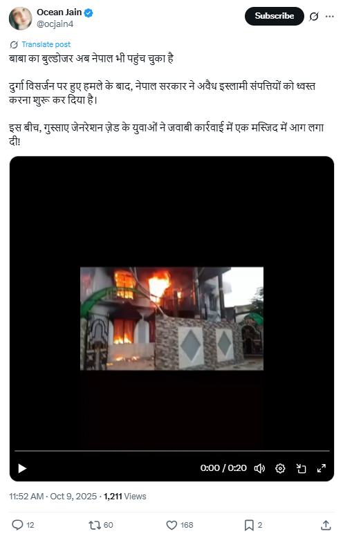 इस वीडियो को ऐसे ही दावे के साथ ओसियन जैन नामक यूजर ने भी शेयर किया है। ओसियन जैन ने लिखा, ‘बाबा का बुल्डोजर अब नेपाल भी पहुंच चुका है दुर्गा विसर्जन पर हुए हमले के बाद, नेपाल सरकार ने अवैध इस्लामी संपत्तियों को ध्वस्त करना शुरू कर दिया है। इस बीच, गुस्साए जेनरेशन ज़ेड के युवाओं ने जवाबी कार्रवाई में एक मस्जिद में आग लगा दी!’