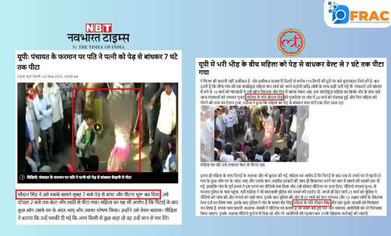 DFRAC की टीम ने वायरल वीडियो की जांच में पाया कि इस घटना में शरिया कानून या मुस्लिम एंगल नहीं है और यह घटना भी हाल-फिलहाल की नहीं है। यह घटना मार्च 2018 में उत्तर प्रदेश के बुलंदशहर की है। हमें इस घटना के संदर्भ में नवभारत टाइम्स और द लल्लनटॉप सहित कई मीडिया रिपोर्ट्स मिलीं, जिसमें महिला की पिटाई करने वाले आरोपी पति का नाम सौदान सिंह बताया गया है।