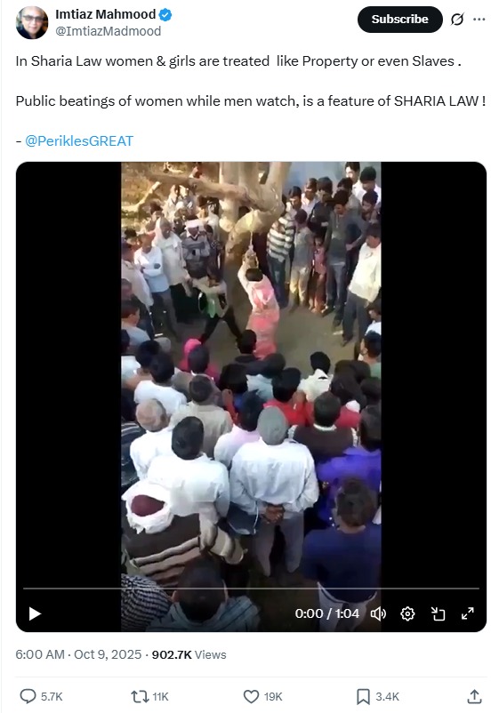 इस वीडियो को शेयर करते हुए Imtiaz Mahmood नामक यूजर ने अंग्रेजी भाषा में कैप्शन लिखा, जिसका हिन्दी अनुवाद है, ‘शरिया कानून में महिलाओं और लड़कियों के साथ संपत्ति या यहाँ तक कि गुलामों जैसा व्यवहार किया जाता है। पुरुषों के देखते-देखते महिलाओं की सार्वजनिक रूप से पिटाई करना, शरिया कानून की एक विशेषता है!’