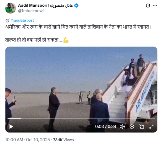 सोशल साईट X पर वेरिफाइड यूजर आदिल मंसूरी ने वायरल वीडियो को शेयर कर लिखा कि अमेरिका और रूस के चारों खाने चित करने वाले तालिबान के नेता का भारत मे स्वागत। ताक़त हो तो क्या नही हो सकता… IMG_256