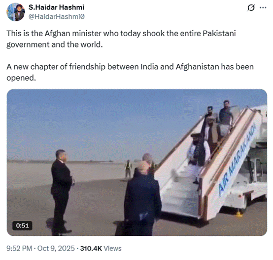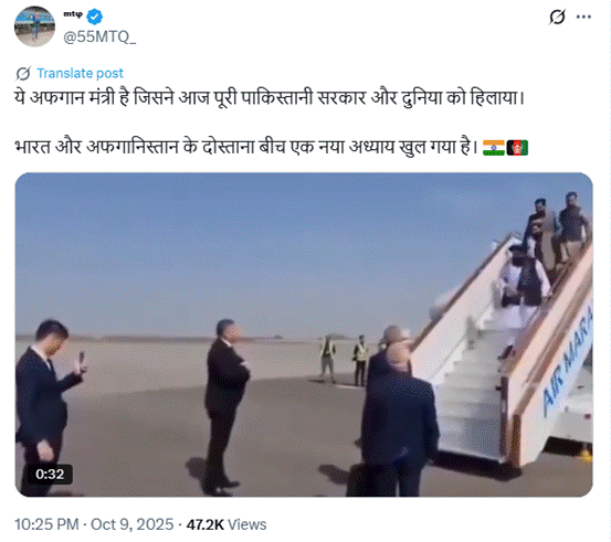 अफगानिस्तान के कार्यवाहक विदेश मंत्री अमीर खान मुत्ताकी गुरुवार को भारत की यात्रा पर पहुंचे हैं। इसी बीच उनका एक वीडियो सोशल मीडिया पर जमकर वायरल हो रहा है। वीडियो में उन्हे हवाई जहाज से उतरते हुए देखा जा सकता है। वीडियो के हवाले से दावा किया जा रहा है कि ये वीडियो उनके भारत आगमन का है।