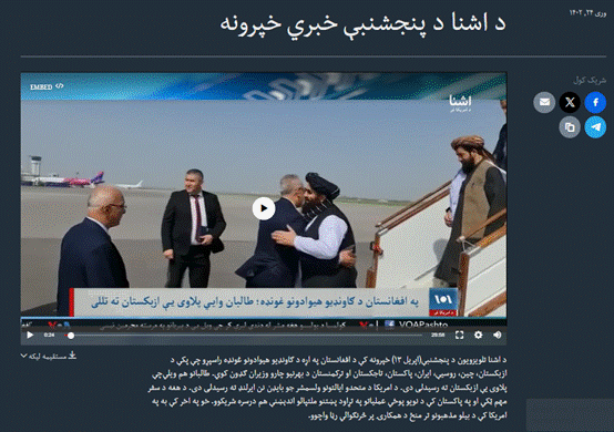 वायरल वीडियो के साथ किये गए दावे की जांच के लिए DFRAC ने वीडियो को सबसे पहले कीफ्रेम में कन्वर्ट किया। फिर कीफ्रेम को रिवर्स सर्च किया। इस दौरान हमें ऐसा ही एक वीडियो वॉयस ऑफ़ अमेरिका के न्यूज़ पोर्टल पर मिला। वीडियो के सबंध में पश्तो भाषा में दिये गए कैप्शन से हमें जानकारी मिली की वायरल वीडियो तालिबान विदेशमंत्री के उज़्बेकिस्तान दौरे का है।