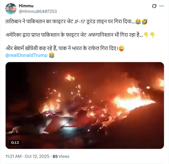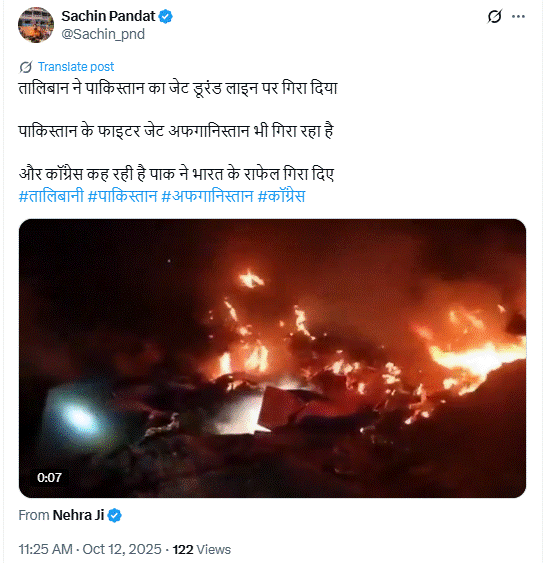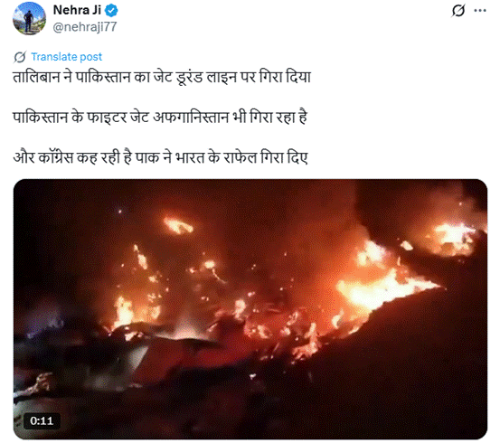 सोशल साइट X पर वेरिफाइड यूजर नेहराजी ने वायरल वीडियो को शेयर कर लिखा कि तालिबान ने पाकिस्तान का जेट डूरंड लाइन पर गिरा दिया पाकिस्तान के फाइटर जेट अफगानिस्तान भी गिरा रहा है और कॉंग्रेस कह रही है पाक ने भारत के राफेल गिरा दिए