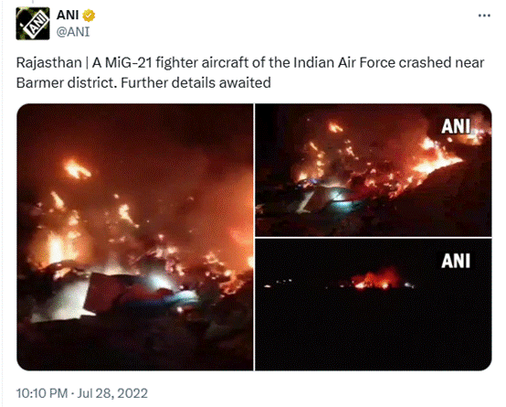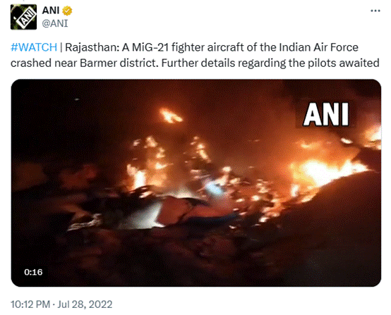 एएनआई के द्वारा वीडियो के बारे में जानकारी देते हुए बताया गया कि ‘वायरल वीडियो राजस्थान स्थित बाड़मेर जिले के पास भारतीय वायु सेना के एक मिग-21 लड़ाकू विमान के दुर्घटनाग्रस्त होने का है।
