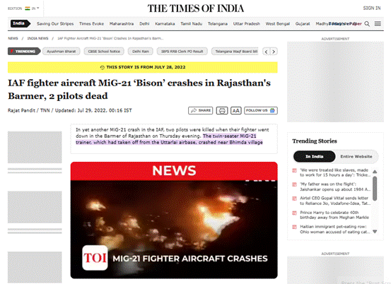 इसके अलावा हमें घटना से जुड़ी टाइम्स ऑफ इंडिया की एक अन्य रिपोर्ट मिली। जिसमे बताया गया कि भारतीय वायुसेना के मिग-21 विमान के दुर्घटनाग्रस्त होने से गुरुवार शाम राजस्थान के बाड़मेर में दो पायलटों की मौत हो गई। उत्तरलाई एयरबेस से उड़ान भरने वाला यह दो सीटों वाला मिग-21 ट्रेनर विमान रात करीब 9.10 बजे रात्रिकालीन उड़ान के दौरान भीमदा गाँव के पास दुर्घटनाग्रस्त हो गया।