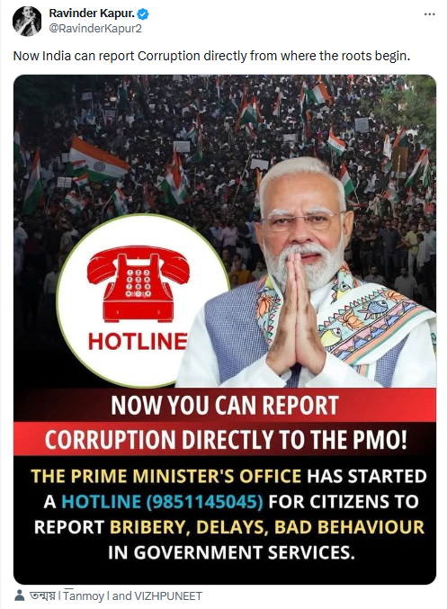 सोशल मीडिया पर एक पोस्टर शेयर किया, जिसमें प्रधानमंत्री नरेंद्र मोदी की तस्वीर लगी है। इस पोस्टर के साथ दावा किया जा रहा है कि अब आप सीधे प्रधानमंत्री कार्यालय (PMO) को भ्रष्टाचार की शिकायत कर सकते हैं! प्रधानमंत्री कार्यालय ने नागरिकों के लिए एक हॉटलाइन नंबर (9851145045) शुरू की है ताकि सरकारी सेवाओं में रिश्वतखोरी, देरी और गलत व्यवहार की शिकायत की जा सके।
