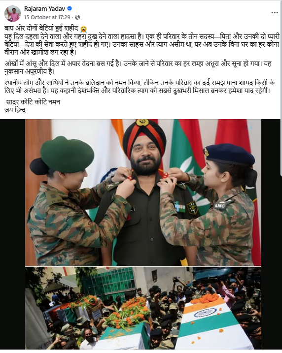 फेसबुक पर राजाराम यादव नामक यूजर ने लिखा, ‘बाप ओर दोनों बेटियां हुई शहीद..यह दिल दहला देने वाला और गहरा दुख देने वाला हादसा है। एक ही परिवार के तीन सदस्य—पिता और उनकी दो प्यारी बेटियां—देश की सेवा करते हुए शहीद हो गए। उनका साहस और त्याग असीम था, पर अब उनके बिना घर का हर कोना वीरान और खामोश लग रहा है। आंखों में आंसू और दिल में अपार वेदना बस गई है। उनके जाने से परिवार का हर लम्हा अधूरा और सूना हो गया। यह नुकसान अपूरणीय है। स्थानीय लोग और साथियों ने उनके बलिदान को नमन किया, लेकिन उनके परिवार का दर्द समझ पाना शायद किसी के लिए भी असंभव है। यह कहानी देशभक्ति और परिवारिक त्याग की सबसे दुखभरी मिसाल बनकर हमेशा याद रहेगी। सादर कोटि कोटि नमन…जय हिन्द’