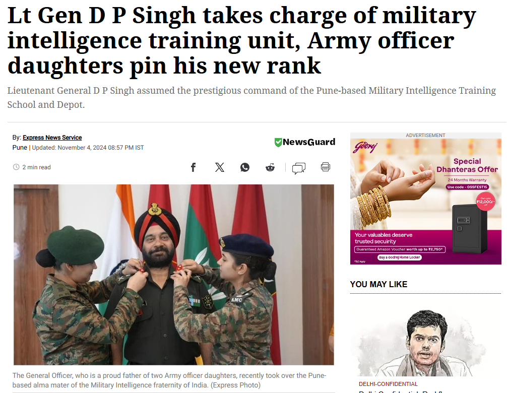 पहली तस्वीर भारतीय सेना के लेफ्टिनेंट जनरल डीपी सिंह की है। यह तस्वीर नवंबर 2024 की है, जब लेफ्टिनेंट जनरल डी पी सिंह ने सैन्य खुफिया प्रशिक्षण इकाई का कार्यभार संभाला था, तब उनकी सेना में अधिकारी बेटियों ने उन्हें नया बैज लगाया था। हमें यह तस्वीर इंडियन एक्सप्रेस की 4 नवंबर 2024 की एक रिपोर्ट मिली। इस रिपोर्ट में बताया गया है कि लेफ्टिनेंट जनरल डीपी सिंह ने पुणे स्थित सैन्य खुफिया प्रशिक्षण स्कूल और डिपो की प्रतिष्ठित कमान संभाली। लेफ्टिनेंट जनरल डी. पी. सिंह, जिन्हें हाल ही में थ्री-स्टार रैंक पर पदोन्नत किया गया और पुणे स्थित मिलिट्री इंटेलिजेंस ट्रेनिंग स्कूल एंड डिपो (MINTSD) की प्रतिष्ठित कमान सौंपी गई, उन्होंने गर्व के साथ उपरोक्त विशेषणों को जीया। सेना ने इस घटना को ‘दुर्लभ और प्रेरणादायक’ बताया और कहा कि यह “सशस्त्र बलों में नारी शक्ति की भावना को उजागर करता है”।