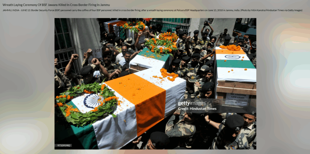 हमारी टीम ने दूसरी तस्वीर की जांच करने पर पाया कि यह वर्ष 2018 की तस्वीर है, जब सीमा सुरक्षा बल (बीएसएफ) के 4 जवान शहीद हो गए थे। गेट्टी इमेजेस पर तस्वीर के साथ दी गई जानकारी के मुताबिक 13 जून, 2018 को जम्मू के पलौरा बीएसएफ मुख्यालय में पुष्पांजलि अर्पित करने के बाद सीमा पार से हुई गोलीबारी में शहीद हुए चार बीएसएफ जवानों के ताबूत ले जाया गया।