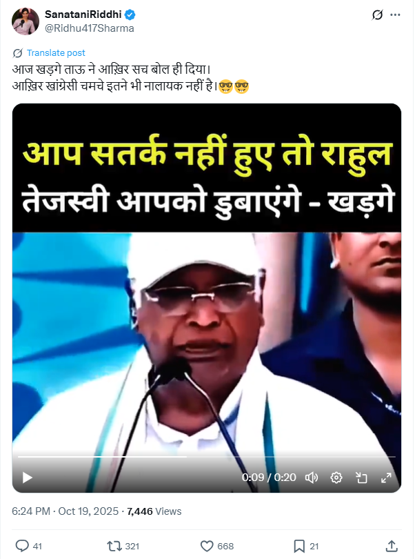 खड़गे के इस बयान को शेयर करते हुए SanataniRiddhi नामक यूजर ने लिखा, ‘आज खड़गे ताऊ ने आख़िर सच बोल ही दिया। आख़िर खांग्रेसी चमचे इतने भी नालायक नहीं है।’