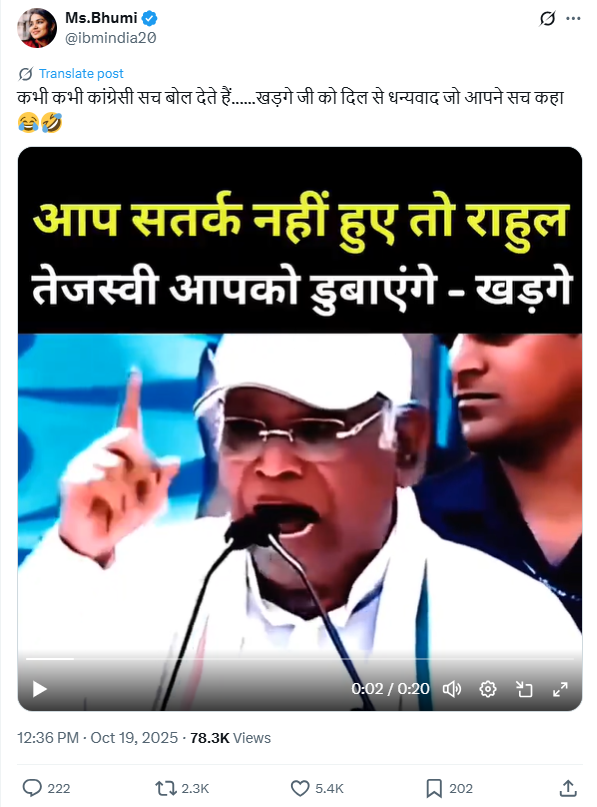 इस वीडियो को शेयर करते हुए मिस भूमि नामक यूजर ने लिखा, ‘कभी कभी कांग्रेसी सच बोल देते हैं……खड़गे जी को दिल से धन्यवाद जो आपने सच कहा।’ इस पोस्ट पर 5400 से ज्यादा लाइक्स और 2300 से ज्यादा रिपोस्ट किए गए हैं।