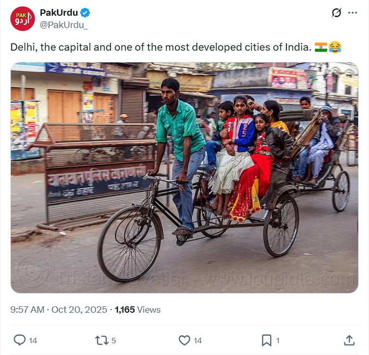 सोशल मीडिया पर एक तस्वीर शेयर की गई है। इस तस्वीर में देखा जा सकता है कि एक रिक्शे पर एक महिला और पुरुष कई बच्चों के साथ बैठे हैं। सोशल मीडिया पर पाक उर्दू नामक यूजर ने इस तस्वीर को शेयर कर इसे दिल्ली का बताया है।