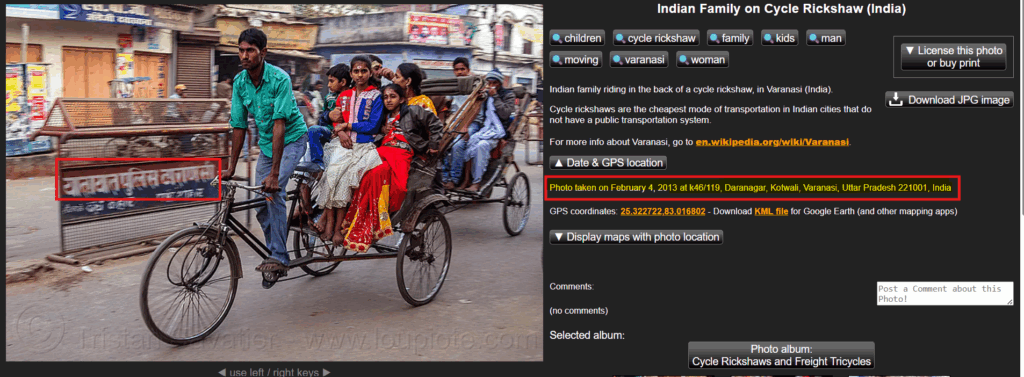 वहीं हमारी टीम ने जांच के दौरान पाया कि तस्वीर पर वाटरमार्क http://loupiote.com लिखा है। जिसके बाद हमारी टीम ने http://loupiote.com की वेबसाइट पर तस्वीर को सर्च किया। हमने पाया कि वेबसाइट पर इस तस्वीर के साथ जानकारी दी गई है कि इस तस्वीर को 4 फरवरी 2013 को क्लिक किया गया है। इस तस्वीर का लोकेशन में दारानगर कोतवाली, वाराणसी-उत्तर प्रदेश दिया गया है।