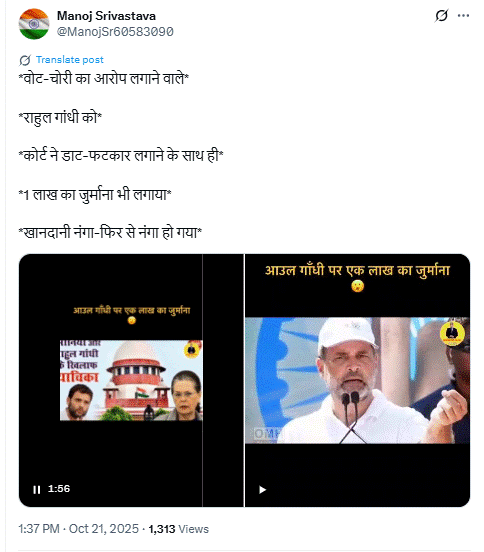 सोशल साईट X पर यूजर मनोज श्रीवास्तव ने वायरल वीडियो को शेयर कर लिखा कि *वोट-चोरी का आरोप लगाने वाले* *राहुल गांधी को* *कोर्ट ने डाट-फटकार लगाने के साथ ही* *1 लाख का जुर्माना भी लगाया*