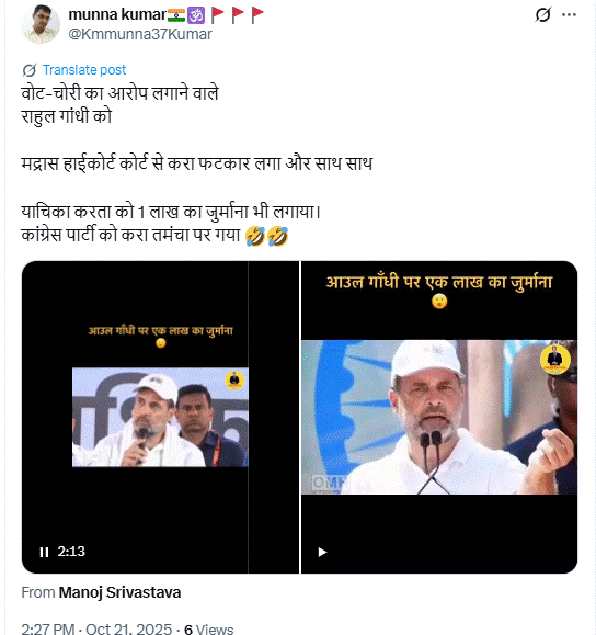 इसके अलावा एक अन्य यूजर मुन्ना कुमार ने भी वायरल वीडियो को शेयर कर लिखा कि वोट-चोरी का आरोप लगाने वाले राहुल गांधी को मद्रास हाईकोर्ट कोर्ट से करा फटकार लगा और साथ साथ याचिका करता को 1 लाख का जुर्माना भी लगाया। कांग्रेस पार्टी को करा तमंचा पर गया