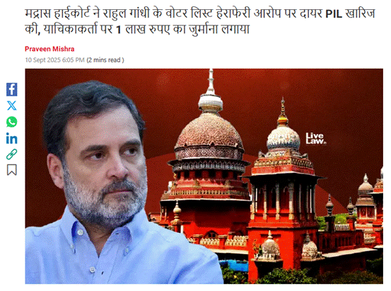 DFRAC के फैक्ट चेक से साबित होता है कि मद्रास हाईकोर्ट द्वारा राहुल गांधी पर एक लाख रुपए का जुर्माना लगाने का दावा भ्रामक है। क्योंकि कोर्ट ने राहुल गांधी पर नहीं बल्कि याचिकाकर्ता वी वेंकट शिवकुमार पर ये जुर्माना लगाया था।