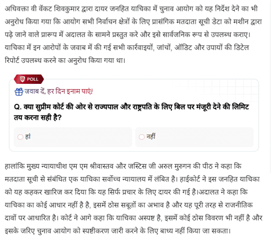 इसके साथ ही हमें समाचार पत्र हिंदुस्तान की एक अन्य रिपोर्ट मिली। जिसमे बताया गया कि अधिवक्ता वी वेंकट शिवकुमार द्वारा दायर जनहित याचिका में चुनाव आयोग को यह निर्देश देने का भी अनुरोध किया गया कि आयोग सभी निर्वाचन क्षेत्रों के लिए प्रासंगिक मतदाता सूची डेटा को मशीन द्वारा पढ़े जाने वाले प्रारूप में अदालत के सामने प्रस्तुत करे और इसे सार्वजनिक रूप से उपलब्ध कराए। याचिका में इन आरोपों के जवाब में की गई सभी कार्रवाइयों, जांचों, ऑडिट और उपायों की डिटेल रिपोर्ट उपलब्ध करने का अनुरोध किया गया था। हालांकि मुख्य न्यायाधीश एम एम श्रीवास्तव और जस्टिस जी अरुल मुरुगन की पीठ ने कहा कि मतदाता सूची से संबंधित एक याचिका सर्वोच्च न्यायालय में लंबित है। हाईकोर्ट ने इस जनहित याचिका को यह कहकर खारिज कर दिया कि यह सिर्फ प्रचार के लिए दायर की गई है। अदालत ने कहा कि याचिका का कोई आधार नहीं है है, इसमें ठोस सबूतों का अभाव है और यह पूरी तरह से राजनीतिक दावों पर आधारित है। कोर्ट ने आगे कहा कि याचिका अस्पष्ट है, इसमें कोई ठोस विवरण भी नहीं है और इसके जरिए चुनाव आयोग को स्पष्टीकरण जारी करने के लिए बाध्य नहीं किया जा सकता।